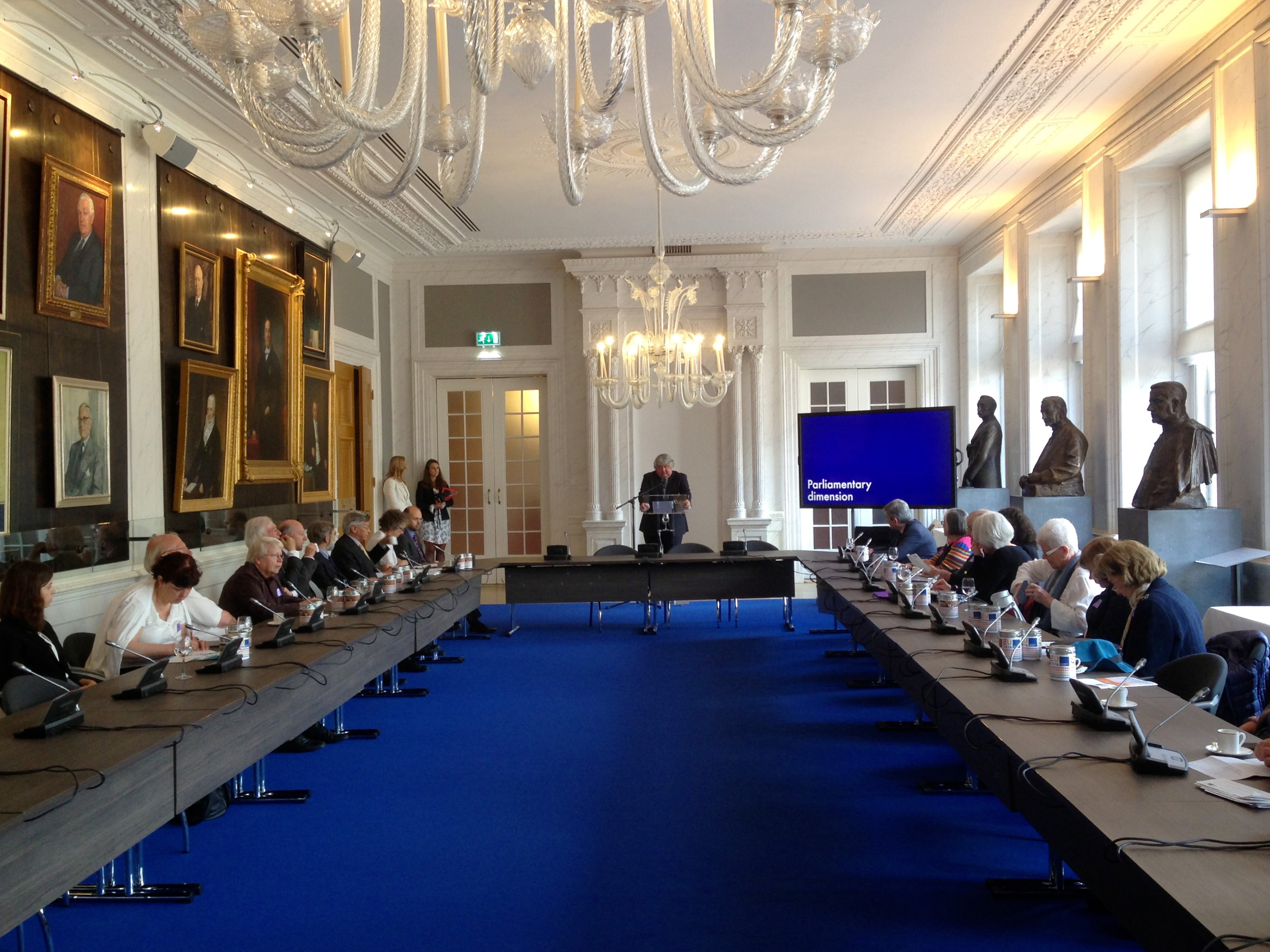 Nous avons ensuite parcouru à pied la courte distance la séparant du Sénat, où nous avons été salués par la présidente de ce dernier, Mme Broekers-Knol.  L’hémicycle du Sénat était pris ce jour-là par une conférence des sénateurs et des représentants de la nation néerlandaise au sens large, provenant des Caraïbes.  Cela nous a rappelé que le Royaume des Pays-Bas n’est pas une affaire exclusivement européenne, mais qu’il incorpore les Pays-Bas, Aruba, Curaçao et Saint Martin.  Le Sénat lui-même est élu indirectement par les gouvernements provinciaux néerlandais. Le moment fort de la visite a été notre session plénière entre les anciens collègues et les membres en fonction de la Chambre des représentants et du Sénat.  Des membres des différentes familles politiques néerlandaises nous ont rejoints.  Au début de la session, notre ancien collègue Laurens-Jan Brinkhorst a dirigé une séance d’introduction sur les Pays-Bas et l’Union européenne. Il a fait valoir que son pays n’avait jamais été très intéressé par l’union politique, mais bien plus par les liens économiques et commerciaux dans toute l’Europe. Les participants à la réunion ont  inévitablement souhaité comprendre le débat sur le Brexit.
