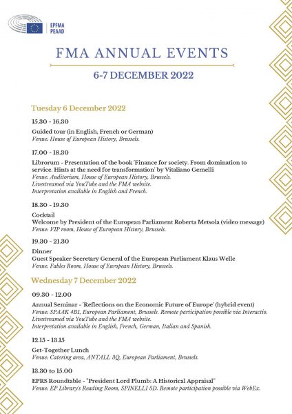 On 7 December, from 9.30 to 12.00 (Brussels’ time), the FMA will organise its 2022 Annual Seminar on ‘Reflections on the Economic Future of Europe’ in the European Parliament, Brussels. The European Union and its member states have faced very serious economic, social, health and environmental challenges accompanied by a very complex and ever-changing geopolitical framework. Leading speakers will discuss the economic scenarios that are being prepared in the short and long term and the actions that should be taken at European level. The audience will be welcomed by FMA President Klaus HÄNSCH.